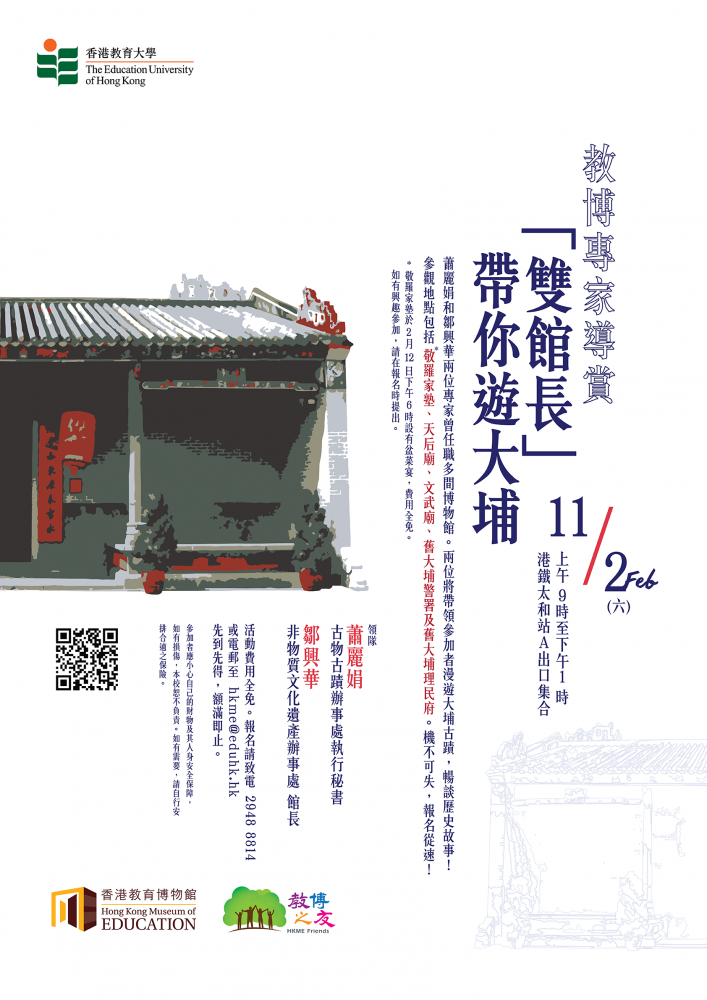 蕭麗娟及鄒興華兩位專家曾任職多間博物館。蕭麗娟女士現主理古物古蹟辦事處,鄒興華先生現任非物質文化遺產辦事處館長。兩位將帶領參加者漫遊大埔古蹟,暢談歷史故事! 參觀地點包括敬羅家塾,天后廟,文武廟,舊大埔警署及舊大埔理民府。