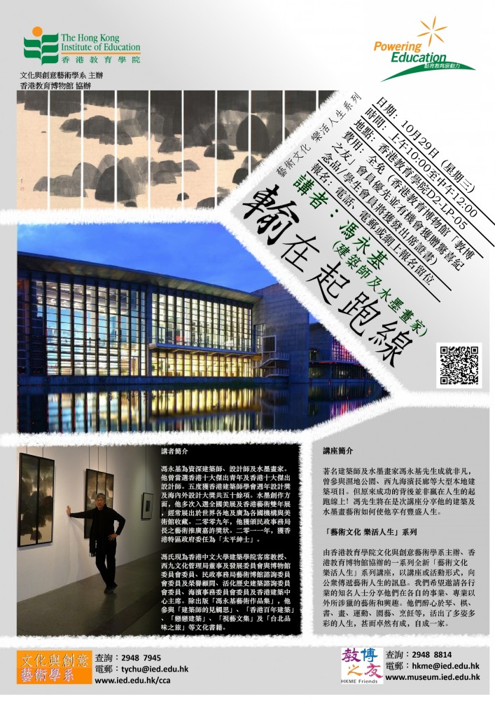 由香港教育學院文化與創意藝術學系主辦、香港教育博物館協辦的一系列全新「藝術文化 樂活人生」系列講座,以講座或活動形式,向公眾傳遞藝術人生的訊息。我們希望邀請各行業的知名人士分享他們在各自行業、專業以外所涉獵的藝術和興趣。他們醉心於琴、棋、書、畫、運動、園藝、烹飪等,活出了多姿多彩的人生,甚至卓然有成,自成一家。